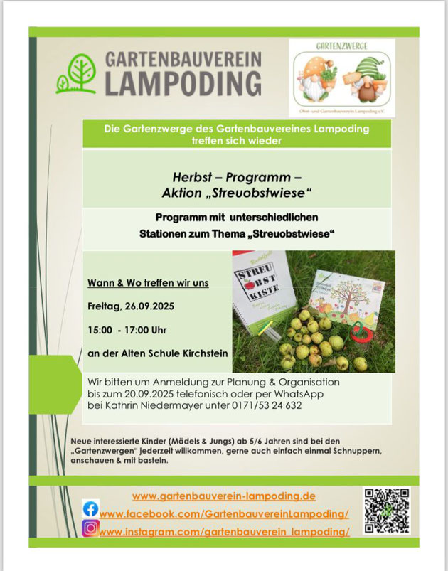 Gartenzwerge-Veranstaltungen an Kathrin Niedermayer, Tel. 0171 53 24 632 jugend@gartenbauverein-lampoding.de