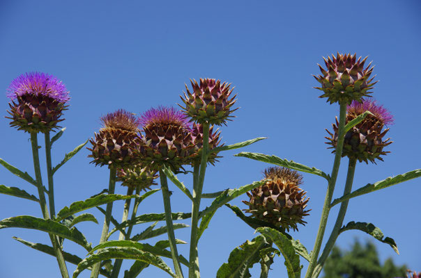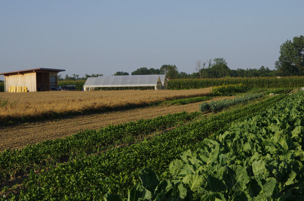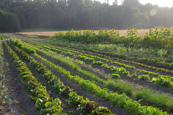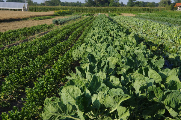 Und so startet die Saison mit verschiedenen Blattsalaten, Zwiebeln, Karotten und Bohnen, es folgen Krautpflanzen wie Wirsing, Weißkohl, Spitzkohl, Palmkohl, auch jetzt im August setzt er noch Brokkoli, Blumenkohl und dann späte Sorten wie Endivien und Radiccio.
