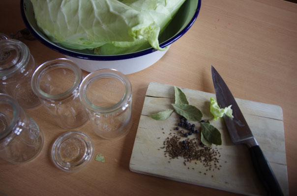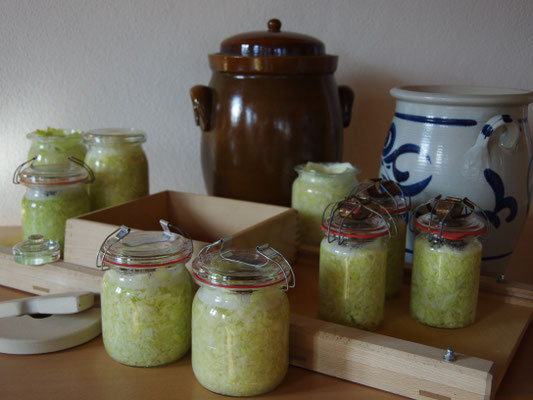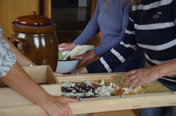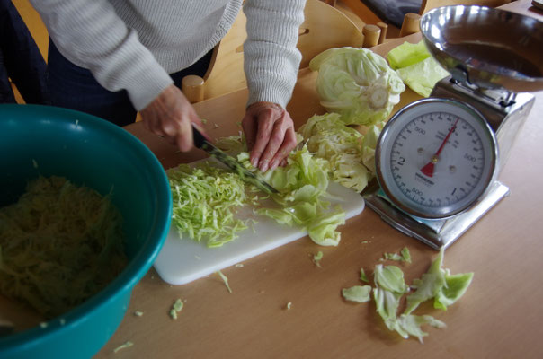 Selber mitzubringen waren, wenn vorhanden, (Kraut-)Hobel, größere Schüssel, Küchen-Waage, Messer, Schneidbrett, Gefäße (Weckgläser, Steinzeug), BIO-Kraut (wichtig), Salz, wer mag Kümmel, Wacholder, Lorbeer.