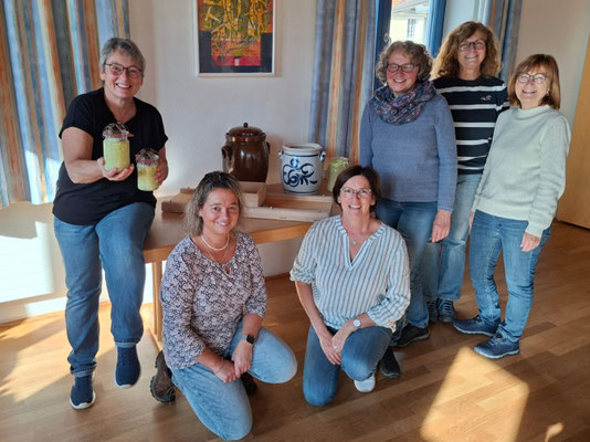 Allen Teilnehmerinnen fiel die Umsetzung unter der Anleitung von Helene leicht und waren erstaunt, wie einfach und energiesparend diese Methode des Haltbarmachens doch ist. Ebenso überrascht waren alle, wie klein das Volumen der gehobelten und in Salz gekneteten Masse war, so dass manches Glas unbefüllt blieb.