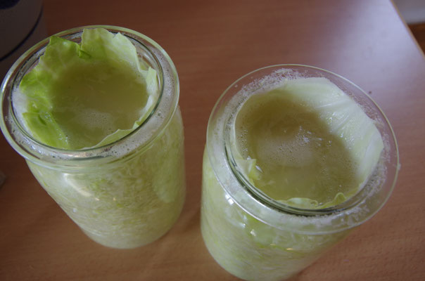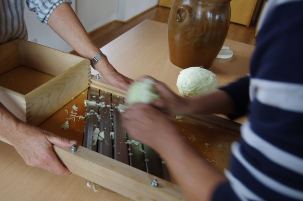 Wichtig beim anschließenden Arbeiten waren Sauberkeit und feines Hobeln oder Schneiden des Weiß- oder Spitzkrauts. Entsprechend dem Gewicht wurde danach 1,5 % Salz in die Masse geknetet, in Gläser gefüllt, mit einem Krautblatt und mit einem Stein abgedeckt, bevor die Gläser mit Deckel und Klammern verschlossen wurden.