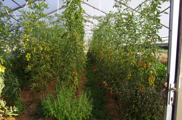 Auf einem Hektar baut er seit 5 Jahren von "Naturland" zertifiziertes Bio-Gemüse an. Als gelernter Landmaschinenmechaniker kommt ihm zugute, dass er viele seiner Sondermaschinen selber austüfteln kann. "Es ist ja ned so, dass ein Gemüsebauer nur knieend Pflanzerl setzt, Unkraut jätet und zum Schluss erntet." so Markus schmunzelnd. Zudem habe er sich für eine "Damm-Kultur" entschieden, weil die Minihügel im Frühjahr schnell Wärme speichern und später die Feuchtigkeit länger halten, außerdem ist damit das Bearbeiten wie Hacken oder Jäten mit seinen kleinen Maschinen einfacher möglich. Wässern tut er im übrigen im Freiland nicht, wohl aber in den beiden Gewächshäusern für Tomaten, Gurken und Ingwer.