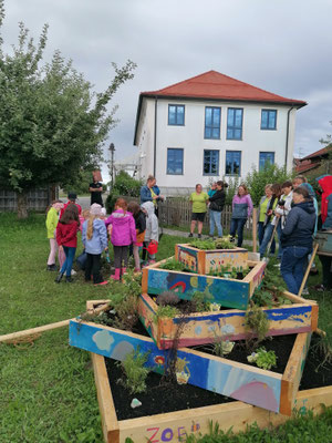Und zeitgleich präsentierten unsere Gartenzwerge ihr neues Pyramiden-Hochbeet. Hiervon darf ab sofort jeder ernten.