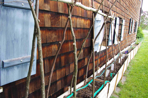 Die Beete bzw. Tröge sind schon vorbereitet und warm. Für die Stangenbohnen sind windsichere Rankhilfen aufgestellt, für die Buschbohnen folgen Zweige nach dem Aufgehen.