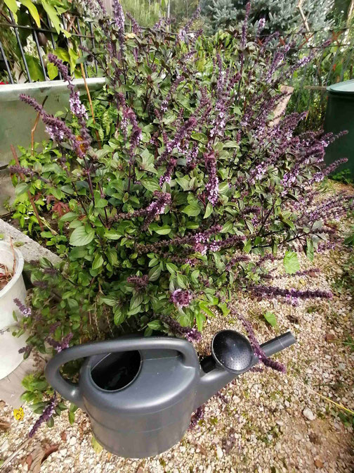 Tipp: Das lila Strauchbasilikum, z.B. African blue, ist unempfindlich, der Geschmack übertrifft den des normalen Basilikums und die lila Blüten sind beliebt bei Bienen und bei uns als Deko.