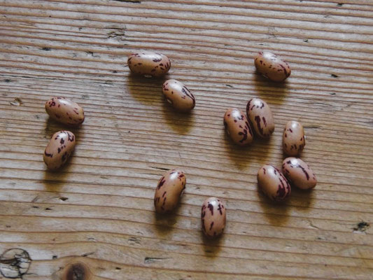 Ausprobiert werden eigene namenlose Bohnen vom letzten Jahr, die kommerzielle Buschbohne Slenderetta, Feuerbohnen und die Sorten Eckendorfer Rotsprenkel, Schwarze Dalmatiner, Sequoia und Thujas Spezial vom ÖBZ sowie Stangenbohnen "Pferdchen" und "Name vergessen" vom Tauschmarkt und Demeter Stangenbohnen Helda, Brunhilde und Neckargold.