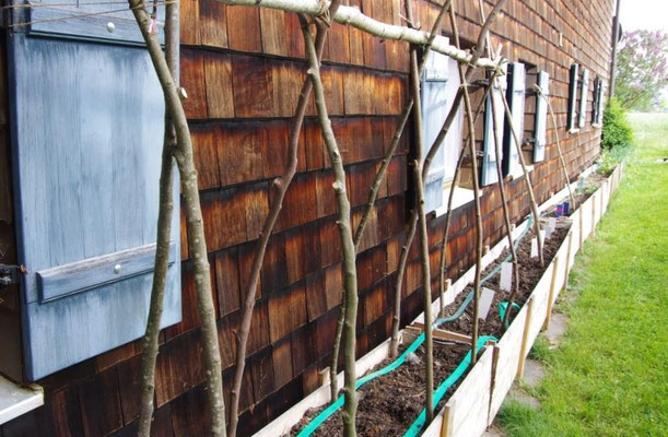 Die Beete bzw. Tröge sind schon vorbereitet und warm. Für die Stangenbohnen sind windsichere Rankhilfen aufgestellt, für die Buschbohnen folgen Zweige nach dem Aufgehen.